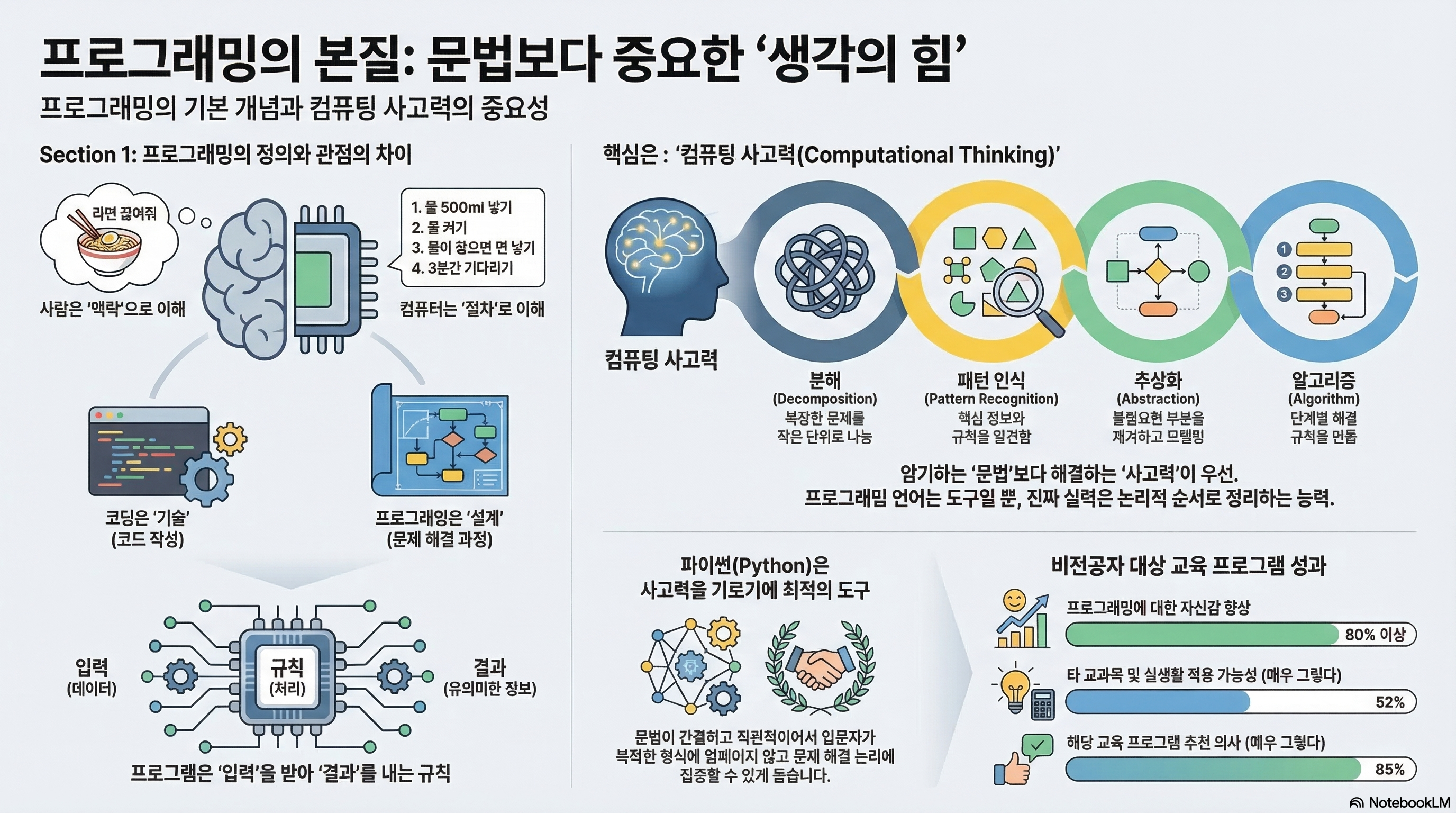 결국 파이썬을 배운다는 것은 파이썬의 문법을 달달 외우는 것이 아니라, 문제를 작게 쪼개고 절차를 설계하는 '컴퓨팅 사고력(Computational Thinking)'을 기르는 과정이다.