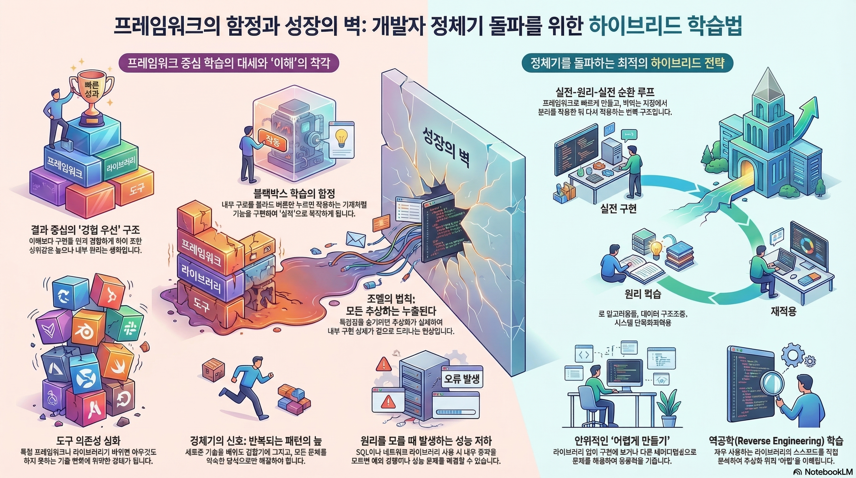 프레임워크의 사용법만 익힌 개발자는 어느 순간 반드시 성장의 한계, 즉 '정체기'에 부딪히게 됩니다. 처음에는 일주일이면 마스터하던 기술이 나중에는 몇 달을 투자해도 제자리걸음인 것처럼 느껴집니다.